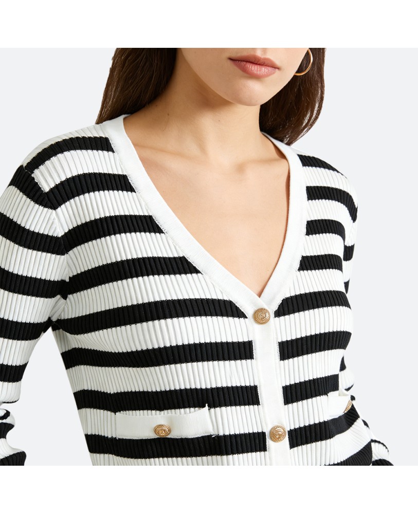 The striped design adds a stylish accent to the overall look, easily pairing with jeans, skirts, or dresses to create a balance of casual sophistication. Whether for work, social gatherings, or relaxed days at home, this cardigan effortlessly highlights your refined and confident style.