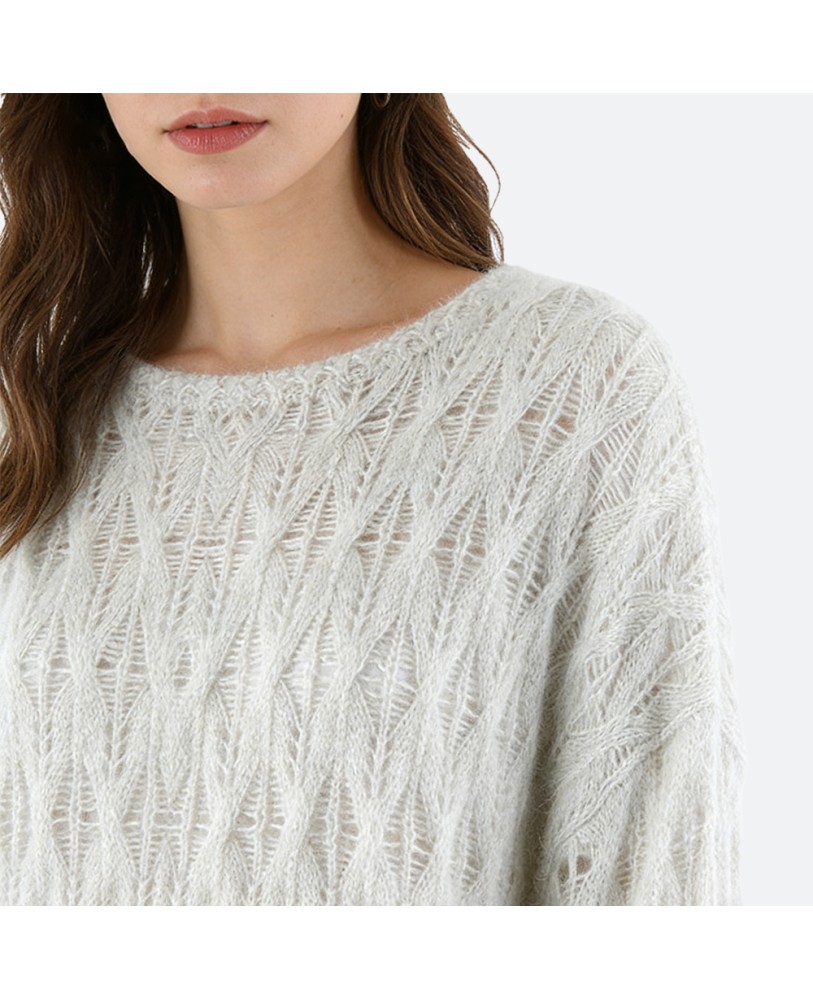 Made from a premium blend of 25% mohair, 21% wool, 30% nylon, and 24% metallic fiber. Mohair and wool bring softness, warmth, and natural elasticity; nylon enhances durability and resilience; while the metallic fiber adds a subtle sheen and a distinctive texture, lending the garment a sophisticated and modern touch.