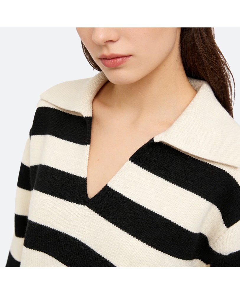 Crafted from premium wool, this classic black and white striped pullover offers a soft, delicate texture and a smooth touch, combining comfort with refined style. The timeless black-and-white palette and simple striped design strike a perfect balance between elegance and modernity, making it a versatile piece for both casual wear and layered looks.