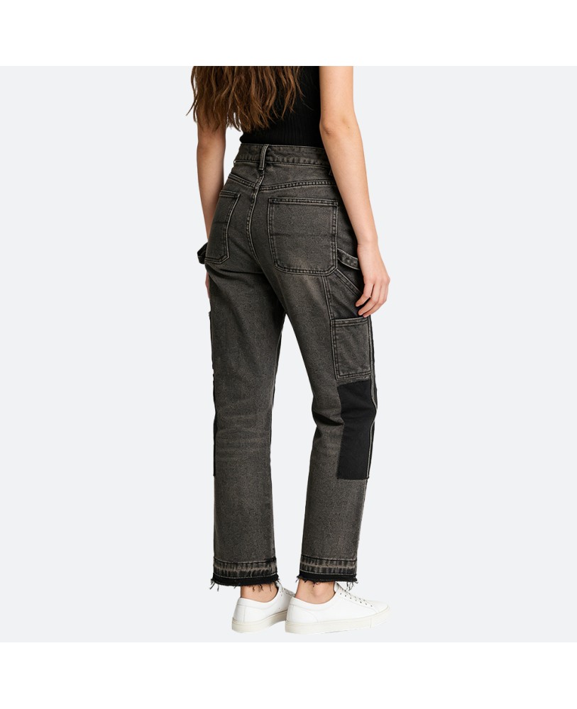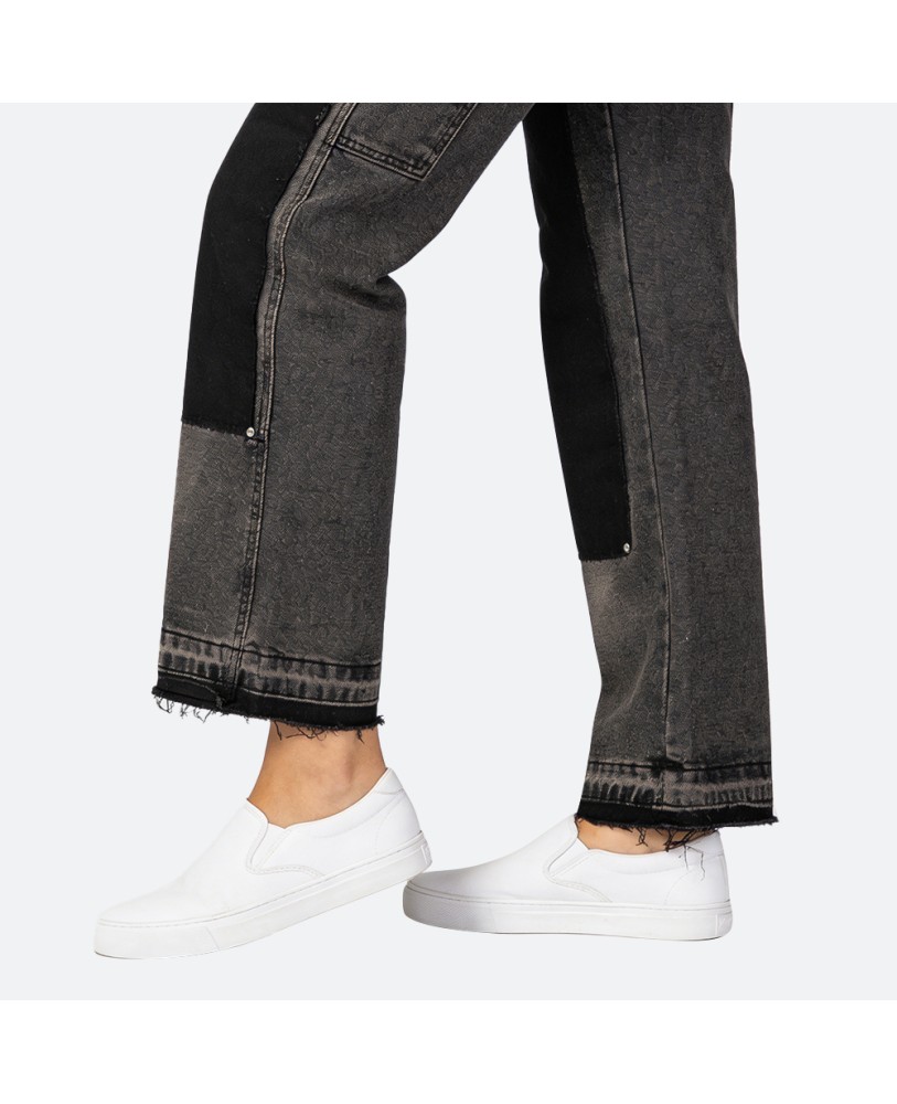 The jeans feature a distinctive washed and distressed finish, creating natural fading and fashionable ripped details that exude a relaxed, street-inspired attitude. The spliced design artfully combines different fabric textures, adding visual depth and a touch of individuality to the timeless straight-leg silhouette.