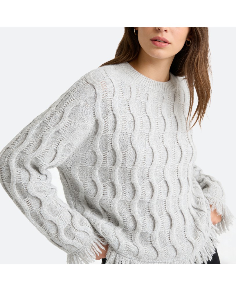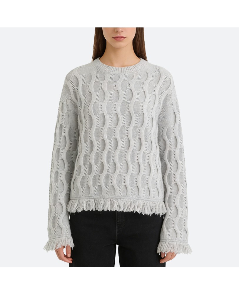 Chunky textured knitting gives the sweater a rich, dimensional look. The classic pullover silhouette with a round neckline makes it easy to pair with jeans, skirts, or tailored pants. Effortlessly chic, it strikes a balance between laid-back comfort and refined elegance.
