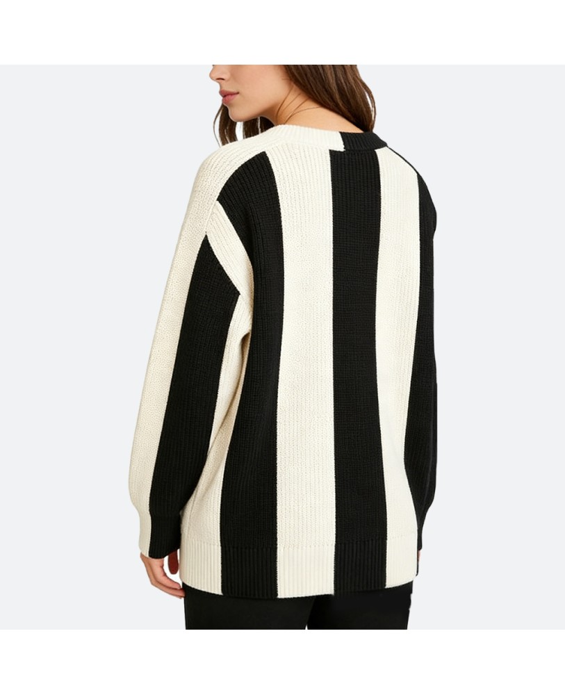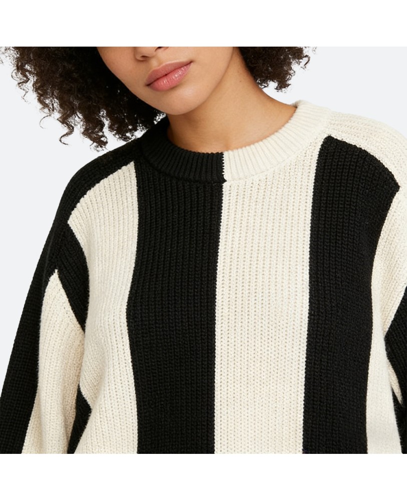 The design features an asymmetric stripe pattern that breaks conventional symmetry, presenting a modern and stylish visual appeal. The relaxed fit provides a flattering silhouette without compromising freedom of movement. Ribbed neckline, cuffs, and hem add refined detail and craftsmanship, enhancing both style and structure.